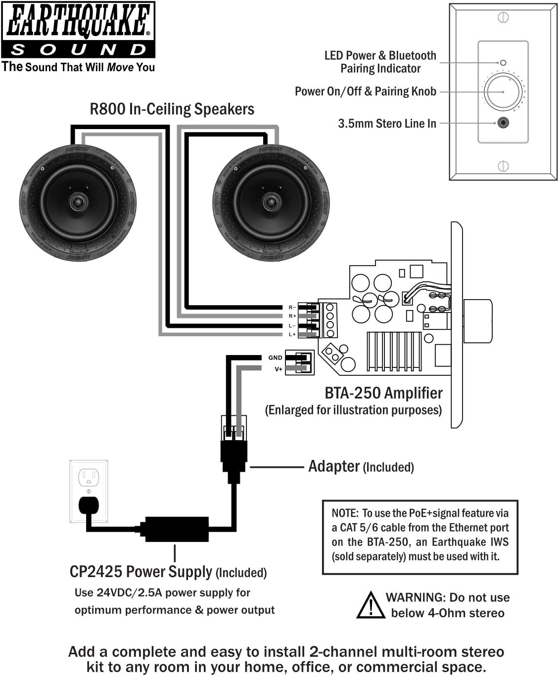 For audio installers and the do-it-yourselfer who need to add a two-channel stereo amplifier in homes or commercial spaces, Earthquake Sound gives to you the BTA-250. Adding an audio zone with Bluetooth capability has never been easier. This is a wireless in-wall amplifier kit that packs flexibility, power, and control into one very small and discrete package that can be used for both indoor and outdoor settings. The BTA-250 kit comes with the in-wall amplifier, B120R retrofit electrical box, 12–24 VDC power supply, and cable adapter. This three input in-wall amplifier can accept signal through the front panel 3.5mm stereo mini jack, Ethernet port, or Bluetooth connection. With the provided 12–24 VDC power supply and cable adapter, the BTA-250 can produce 50 WRMS per channel and can easily power a pair of ceiling, outdoor, or in-wall speakers. It is compatible with 4-Ohm and 8-Ohm systems and also features a front mounted volume control knob for added convenience. Designed to fit into a standard single-gang junction box, the BTA-250 can be easily installed into any new or pre-existing constructions (home, bars, restaurants, hotel rooms, etc.). For home installations, the BTA-250 can be a great addition for your garage, workshops, sheds, and even around hot tubs and pool areas. Wherever you feel the need to add an audio zone, Earthquake's new BTA-250 will conveniently expand your home audio system giving you a multitude of installation ideas.