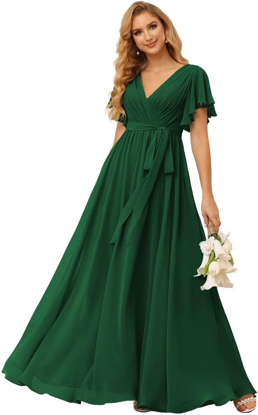 Welcome to our store!Product Features:Fabric: ChiffonSilhouette: A LineNeckline: V NeckSleeve: Ruffled SleeveHemline: Floor LengthClosure: ZipperWarm Tips:It is VERY important to know how to choose a proper size for shopping online, especially formal gowns. To help you get the dress with perfect fit, please follow the steps below to find the correct size.▸Measure your waist, bust, hips and compare with our own size chart. ▸If these measurements do not belong to one standard size, choose the bigger one.▸Normally, no one's figure is in exact standard size. If the dress size differs little from your own size, you could find a tailor to make a minor alteration. All our dresses come with additional fabric in the seams.If you want the dress to be customized, please provide us following measurements.1.Full Bust _____ cm/inch.2.Waist _____ cm/inch.3.Hips _____ cm/inch.4.Hollow to floor(bare feet) _____ cm/inch.5.Heel height _____ cm/inch.6.Phone Number _____7.The date you need the dress _____Kindly Note:Be aware that the colors in the photograph may not accurately depict the exact color due to differences in lighting or computer displays.